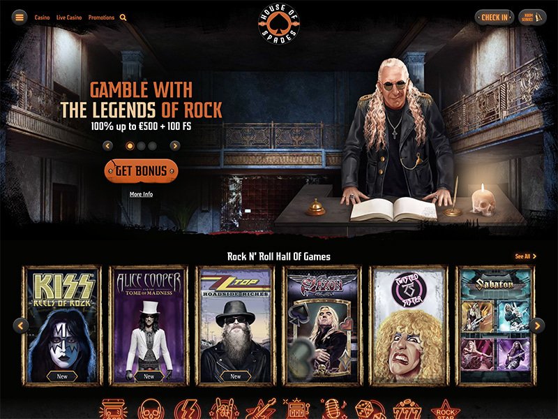House Of Spades vous propose plus de 4,000 machines à sous en particulier des slots rock. Ainsi que toutes les autres régulières avec des thèmes différents. Les bandits manchots sont soigneusement sélectionnés pour répondre aux besoins et aux exigences de chaque parieur. Parmi les titres populaires, se trouvent Rise of Olympus, Gonzo's Quest Megaways, Temple Tumble, Sakura Fortune, Money Train, Big Bass Splash, Book of Dead, Gates of Olympus, Buffalo Trail, Starburst, Big Bad Megaways, Sweet Bonanza, Legacy of Dead, Razor Shark, Reactoonz, Viking Go Berzerk, The Dog House et plus. Les titres de jeux de Rock incluent Kiss Reels Of Rock, Dio-Killing The Dragon, ZZ Top-Roadside Riches, Sabaton, Twisted Sister, Testament, House Of Doom, Helloween, Annihilator et Parrots Rock. House Of Spades casino en ligne vous propose également un grand choix de jeux de table et de cartes notamment European Roulette, Oasis Poker, French Roulette, Multihand Blackjack, Baccarat, Super 7 Blackjack et autres.