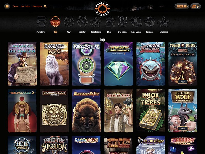 Les jeux du casino en ligne House Of Spades sont classés en neuf sections avec un design similaire. En accédant à chaque catégorie, vous verrez environ 20 titres et à la fin de la liste, il y a le bouton "PLUS DE JEUX". Le choix de jeux sur ce site est incroyable, vous pouvez profiter d'innombrables heures de plaisir et d'excitation. House Of Spades dispose d'un moteur de recherche perfectionner qui vous facilite la navigation. L'icône de loupe située en haut vous permet de retrouver les jeux par nom, développeur ou catégorie. Après avoir entré quelques lettres dans le champ de recherche, une liste apparait sous la barre avec tous les résultats correspondants. En pointant la souris sur un titre, son nom et son fournisseur s'affichent en bas. Toute cette merveille a été possible avec la participation de nombreux développeurs tels que NetEnt, Play'N Go, Pragmatci Play, Yggdrasil, Quickspin, Betsoft, Push Gaming, Evolution Gaming, Red Tiger, Fugaso, Rabcat, Endorphina, GameArt, Zillion Games et bien d'autres.