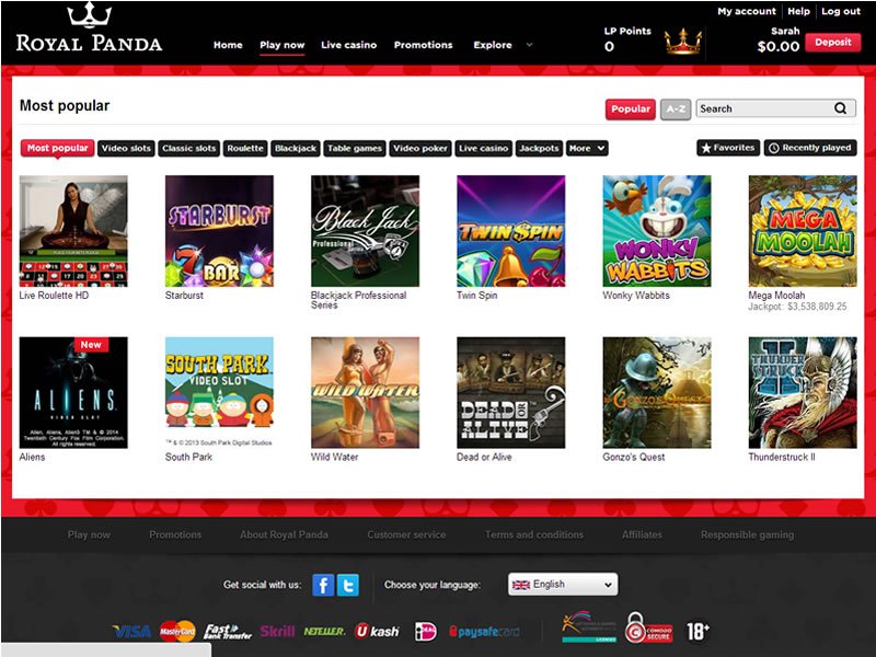 Établissement de paris en ligne très prisé par les Canadiens, Royal Panda Casino a su retenir l'attention de nos experts. La plateforme dispose d'une licence Malta Gaming Authority et elle donne à ses clients la chance de parier sur plus de 1,000 jeux. En partenariat avec des développeurs de jeux bien connus, notamment Evolution Gaming, Royal Panda propose plus de 10 jeux live de roulette parmi ses innombrables titres disponibles. Pour évaluer l'opérateur, nous nous sommes également basés sur les moyens de paiement, son système de sécurité ainsi que son service client.