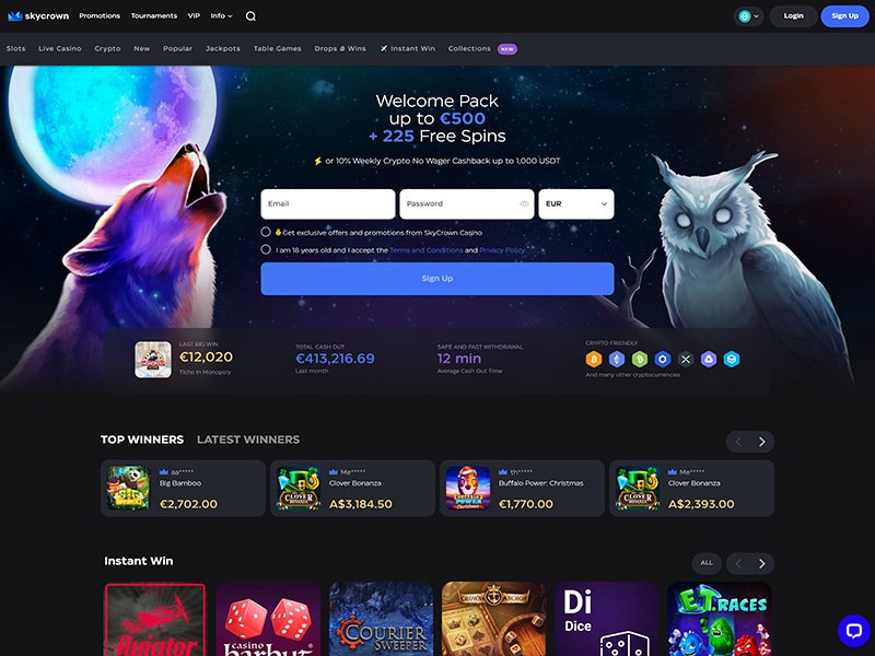 Skycrown Casino a démarré ses activités au Canada en 2021. Il est détenu par la compagnie Hollycorn N.V qui opère sous une licence de la Commission des jeux de l'État du Curaçao. Skycrown Casino s'est associé aux éditeurs de logiciels de bonne renommée tels que Microgaming, Play'n Go, Pragmatic Play, Relax Gaming et Quickspin. Notre équipe éditoriale a testé ce site pour vous et a remarqué que ce dernier à une impressionnante ludothèque de +7500 titres. Nous avons également noté que vous pouvez parier avec les cryptomonnaies comme le Bitcoin, Ethereum sur ce casino en ligne. Découvrez-en plus dans cet article.
